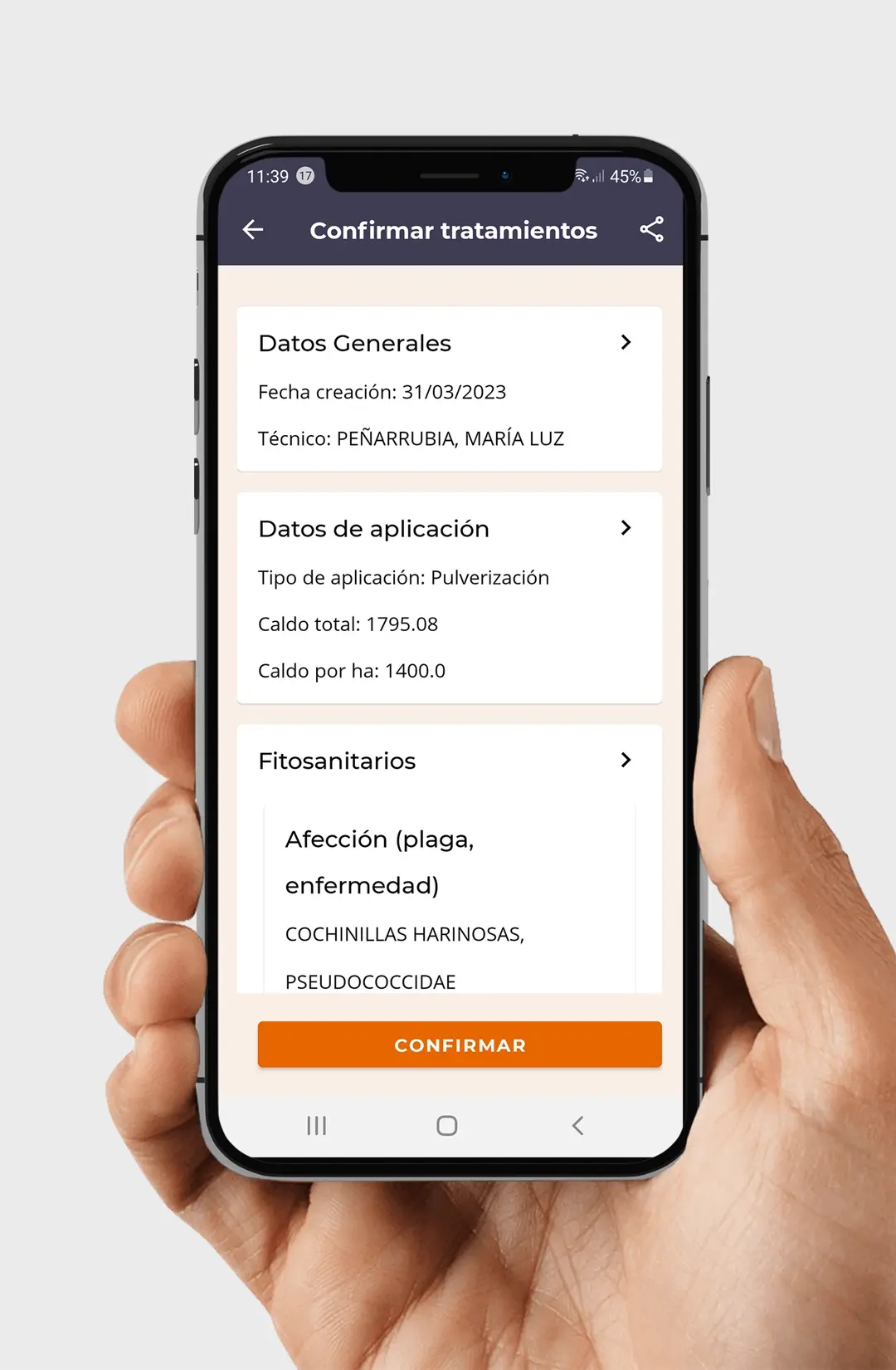 El objetivo de nuestra aplicación es hacer que te resulte fácil lo que puede ser difíicil. Por eso, por un lado, el manejo de la app es muy intuitivo y sencillo, la propia app te va guiando sobre lo que tienes que hacer. Pero además, y de manera única, basándonos en el problema que tengas, nuestro modelo de gestión de las actuaciones fitosanitarias va recomendando al asesor o agricultor en la elección del tratamiento de forma automática.